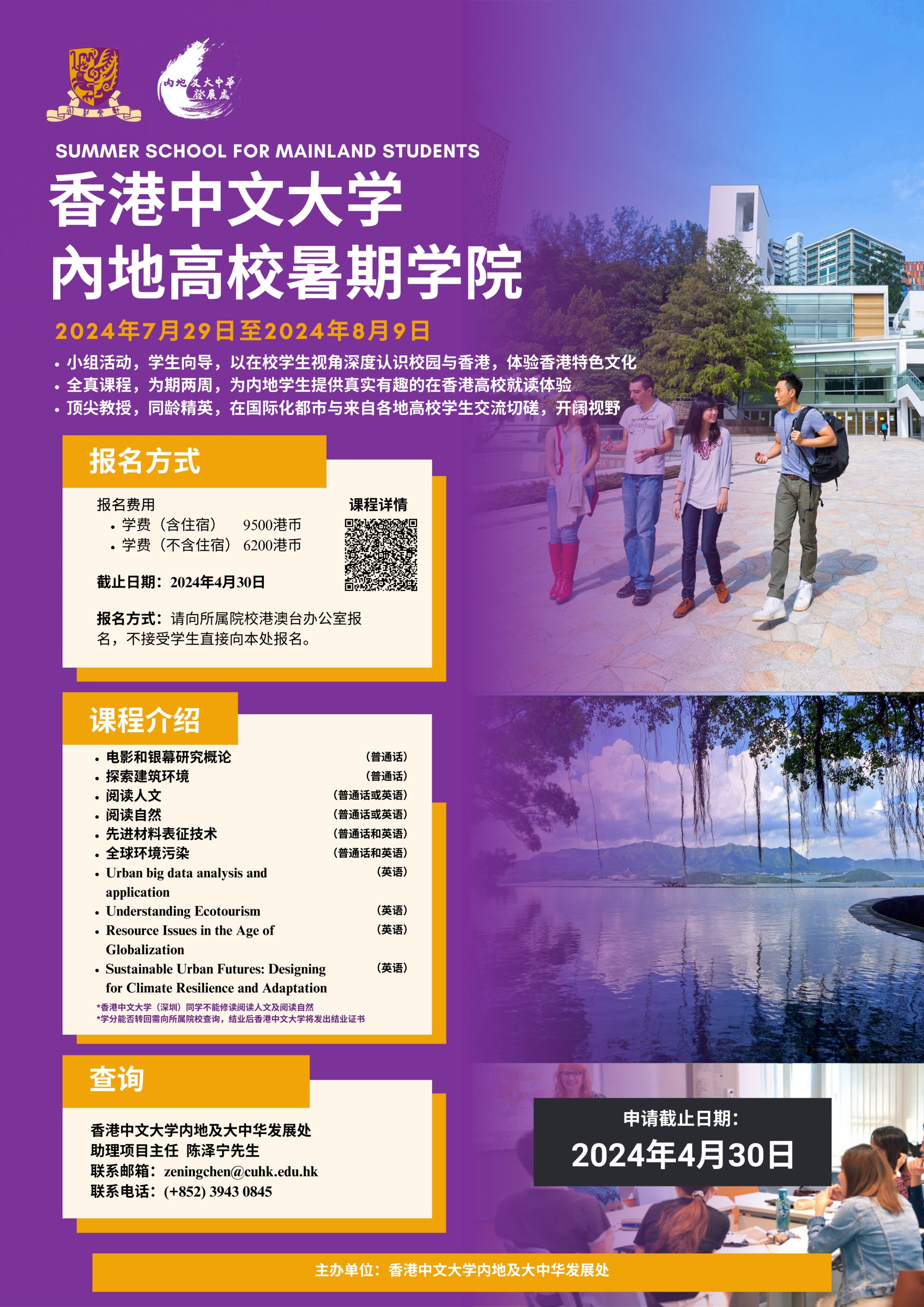 香港中文大学(中大)自2020年起首次举办粤港澳高校联盟夏日学院之「香港中文大学 - 粤港澳大湾区暑期学院」受到联盟粤方成员以及大湾区本科生热烈欢迎。承接过往几年暑期学院的成功,今年港中大继续举办「香港中文大学 – 内地高校暑期学院」(暑期学院),招生范围扩大到内地和澳门的所有合作伙伴院校,并期望招募更多来自不同地区的学生加入。暑期学院将于2024年7月288月10日举行,提供十门课程供学生选择其中一门修读课程信息见附件1:宣传海报。学院是为期两周的学分科目,课程采用实体教学模式,与其他学生互动交流,开阔视野。
